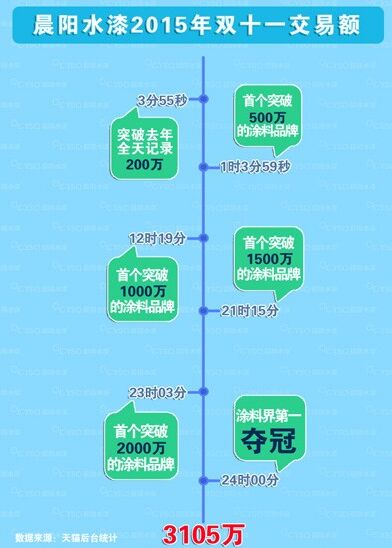 從11月11日凌晨開始,晨陽水漆天貓旗艦店就開始源源不斷的涌入了對水漆產品期 待已久的消費者,產品銷量也是一路扶搖直上。不到3分鐘,晨陽水漆銷售額達到140萬,6 分28秒時,突破300萬,僅用了一個小時就打破了500萬的銷售記錄,截止到12::19,晨陽 水漆銷量破千萬,遙遙領先其他品牌。最終,涂料十大品牌晨陽水漆以3105萬擊敗了立邦、多樂士等品牌涂料,奪 得雙十一涂料銷售冠軍。
