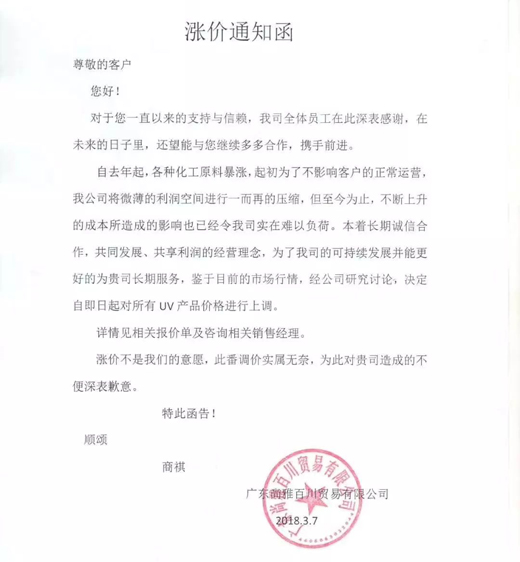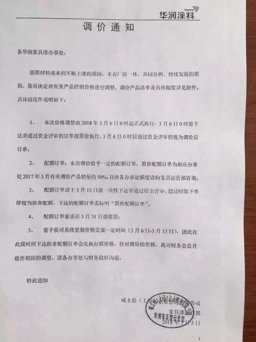 3月13日,展辰集團在發布的“關于對產品銷售價格進行調整的通知”中稱,自4月1日起對家具漆產品銷售價格上調5%以上(部分品種10%以上);3月15日,嘉寶莉集團發布“2018年漲價預警通知”,包括面漆、底漆、固化劑、稀釋劑及UV類產品,價格上調幅度分別為7-9%、6-8%、8-12%、6-7%、20-25%;華潤家具漆于2018年3月6日0時起正式調價;紫荊花漆集團也發布通知于4月1日起正式對家具漆產品價格上調5%,部分上調10%。