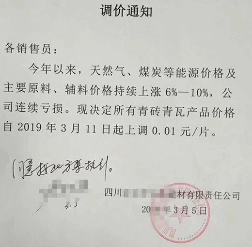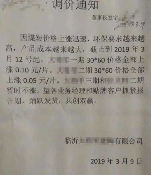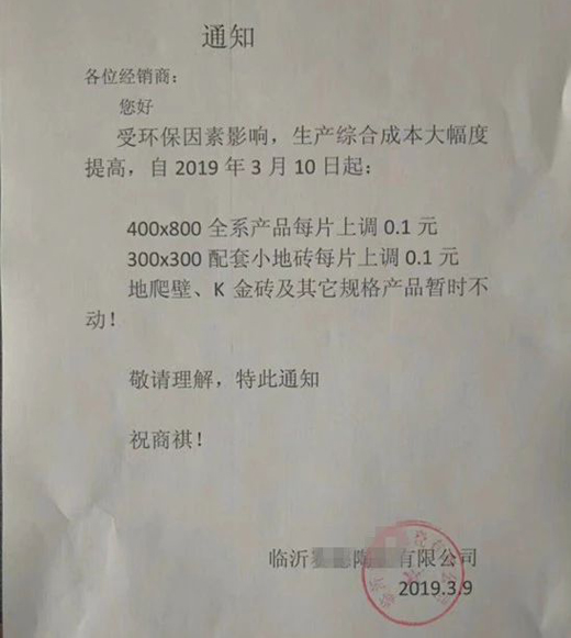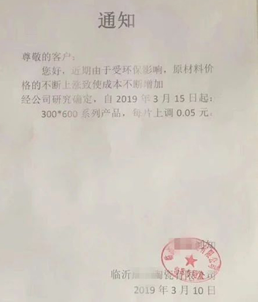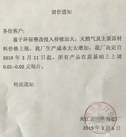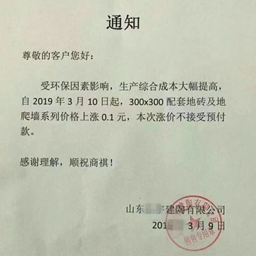 從臨沂多家陶瓷廠發(fā)出的漲價通知顯示,漲價的主要原因是受環(huán)保等因素影響,原材料價格持續(xù)上漲。漲價涉及的產(chǎn)品主要是瓷片和小地磚,300×600(mm)瓷片上漲0.05-0.1元/片,400×800(mm)瓷片上漲0.1元/片,300×300(mm)小地磚上漲0.1元/片。