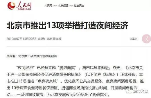 北京:2019年7月12日,北京市商務局印發《北京市關于進一步繁榮夜間經濟促進消費增長的措施》的通知。明確到2021年底,在全市形成一批布局合理、管理規范、各具特色、功能完善的“夜京城”地標、商圈和生活圈,滿足消費需求。