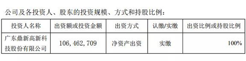 公告稱,以母公司部分經營性資產、負債(包括應收款項、預付賬款、其他應收款、存貨、機器設備、土地、房屋建筑物等資產,以及部分負債)打包,以打包的經營性凈資產出資設立全資子公司惠州鼎新高新材料有限公司,具體出資情況以審計報告、資產評估結果和工商部門核定為準。投資標的基本情況(具體情況以工商登記為準)。
