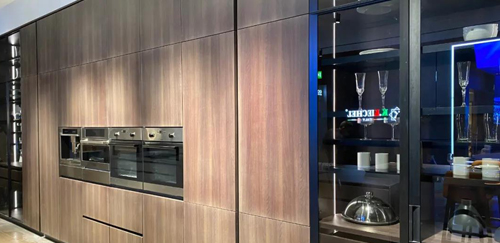 不銹鋼高柜兩邊的玻璃柜門,弱化了煙熏木紋的大面積色調空間,單邊免把手柜門設計,雙門開關毫不費力,體現不一樣的精致。鏡面通透敞亮,內置物品清晰可見,讓空間更豐富立體。