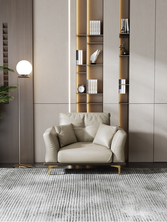 對于小戶型來說,三人座沙發太占地方,小戶型客廳最先犧牲掉的就是沙發區域。只要留有1平米左右的空間,就可以放一個mini單人沙發。洛品有家真皮單人沙發椅裝飾,顏色淡雅,始終給人溫馨、沉穩的感覺。休閑味道滿滿的簡約款式,放在臥室、陽臺或是客廳都可以,飽滿的坐墊帶來舒適的體驗,用一盞落地燈籠罩溫馨,家的愜意不過如此。