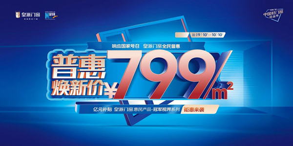 面對新品質消費時代,皇派門窗在國家政策引導下以“惠民煥新”行動跑出“加速度”。此次,為迎接“金九銀十”傳統家裝旺季,皇派門窗率先官宣重磅惠民政策,響應國家促進家居消費的號召,推出首屆中國好門窗超品節,發布全民惠民新品——799㎡/元冠軍視界系列門窗,大手筆真讓利、真惠民,直接補貼終端,全面激發家居市場的消費熱情,同時作為對消費者最具誠意的回饋。