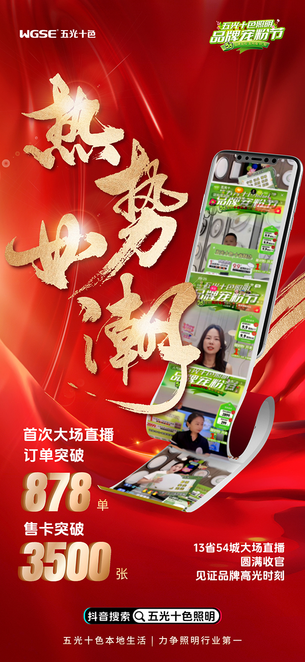 在照明行業競爭白熱化、渠道變革加速的關鍵時期,五光十色照明以抖音本地生活運營為突破口,打造的“品牌寵粉節”無疑是一場極具前瞻思維賦能終端的生動實踐。其通過“線上精準引流-大場直播轉化-線下體驗承接”的全鏈路營銷閉環,真正將流量轉化為終端商家的實在業績。