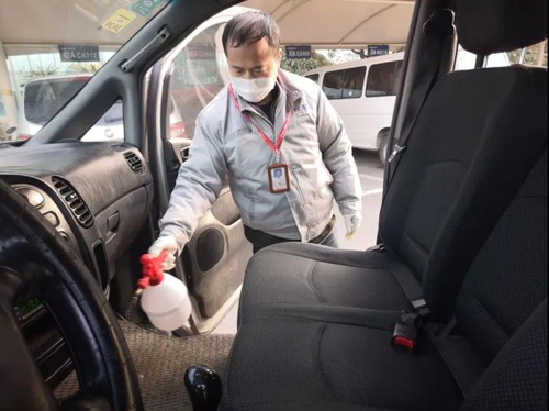 為了運輸物資及返崗員工安全,張玉杰每一次出車前都會對車輛進行仔細消毒,并隨車配備必要的防疫用品與用具。