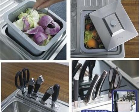 普樂美屈米空間大師系列水槽配有菜板、瀝水籃、瀝水板、線籃、刀具盒、刀具等配件,其擱放瀝水板和菜板的凹槽軌設計成雙層結構,菜板和瀝水板可以拉來拉去,甚至能夠重疊在一起,完全不影響使用,充分將洗切一體化,有效節省了空間;而刀架的塑料盒可以獨立取出,避免了底部因長時間使用而造成的積水現象。