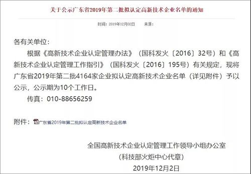 12月2日,全國高新技術企業認定管理工作領導小組辦公室公示“廣東省2019第二批擬認定高新技術企業名單的通知”,ROMNEY羅姆光電系統技術(廣東)有限公司在公示企業名單中,這標志著再次通過高新技術企業認定! 據了解,早在2016年11月羅姆尼光電已通過了高新技術企業稱號。