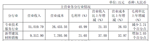 建研院年報顯示,報告期內,公司的主營業務包括工程技術服務以及新型建筑材料生產銷售。其中,工程技術服務包括工程檢測、工程專業施工(保溫、防水、加固)、工程設計以及工程監理等技術服務;新型建筑材料包括防水卷材、防水涂料、混凝土外加劑、保溫材料、建筑結構膠等建筑材料。