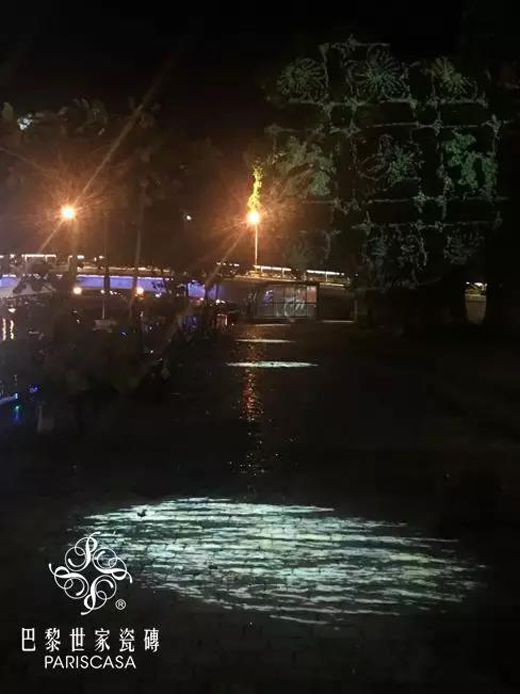 魔幻的藝術(shù)燈光,在石板地面、郁青古樹上投射出,帶有濃郁歷史韻味的符號,帶人回溯古代的文明,烘托著運河歷史濃郁的氛圍。
