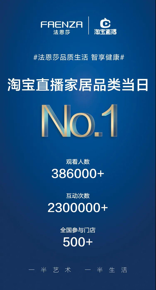 法恩莎品質生活 智享健康全國大型線上直播活動于3月17日火熱進行,活動當晚,法恩莎衛浴位列淘寶直播家裝品類當日No.1,獲得淘寶直播首頁及家具行業精選推薦。