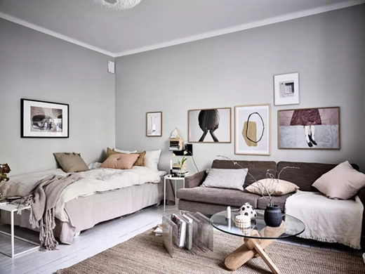 如果不想要純白色的墻面,可以嘗試把墻刷成灰色。灰色是中性色,能讓空間比較有高級感。想讓空間整體沒那么冷冰冰,更女性一點,更溫暖,可以選擇粉色和其他暖色調。