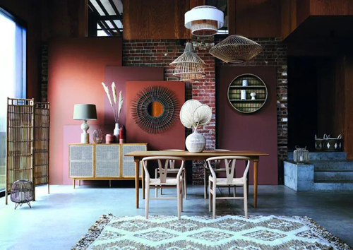 做舊的皮革和洗水織物隨處可見,讓人想起了遙遠國度的悠久歷史。泥土色調、駝色為赤陶的質感增添了溫暖感, 而有機手工制作和手工編織的紡織品則增添了樸實的感覺。