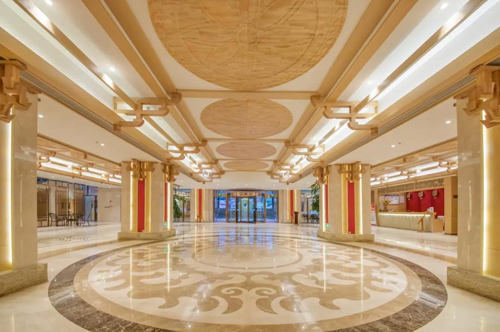 彝海結盟酒店的大堂給人的第一印象是富有中式韻味,在設計的過程中保持色溫的一致性,采用暖光源,天花使用塞尚筒燈勾勒出裝飾天花的輪廓,用燈帶洗亮墻柱,給人以中式富麗的印象。