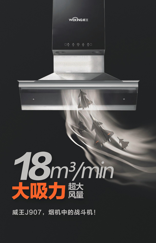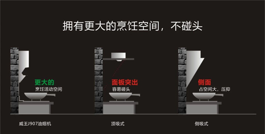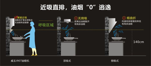距離灶具面板580mm附近的高度,是吸油煙機升騰和擴散的臨界點。威王J907吸油煙機的吸煙口距離灶具臺面僅480mm,急速吸排,升騰油煙無處可逃,還未擴散就被吸走,不會有櫥柜、餐具沾滿油污的情況,更不會有因吸入油煙造成人體呼吸道疾病的事情發生。