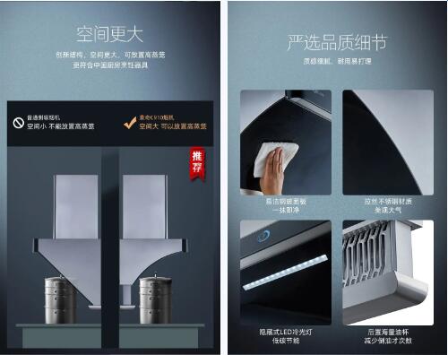 在現(xiàn)在這個寸土寸金的社會上,家居空間也被一再壓縮,因此用戶對小、薄這些需求也越來越強烈。索奇C910吸油煙機超薄款設(shè)計,黃金尺寸不碰頭。視野更廣闊,即使是高蒸籠也能輕松放置,釋放更多的烹飪空間。