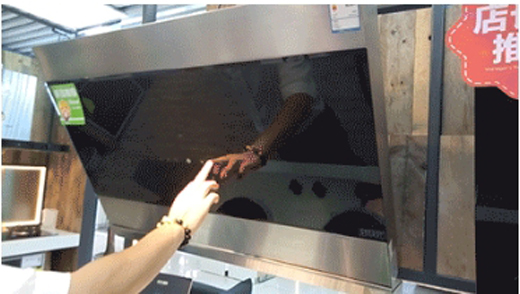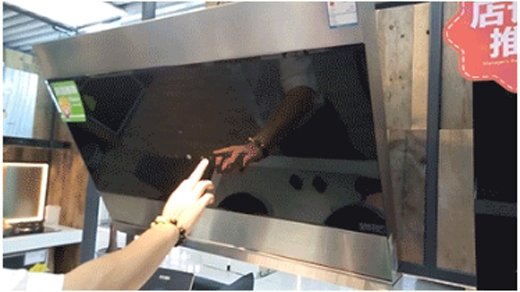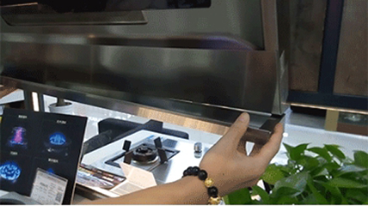 這個操作,老板電器實際用起來怎么樣呢?測試人員將手對準操作面板輕輕一擺,油煙機就自動開啟了,再一擺它就加大了排煙速度(即一鍵提速),要關閉一鍵提速就再次用手掌對準操作面板一擺,便可自動關閉,其感應非常靈敏,使用超級方便。