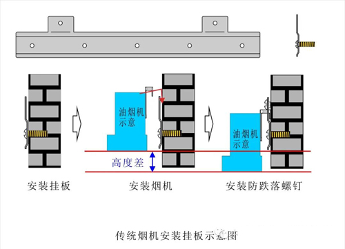 傳統煙機安裝掛裝,上抬煙機兩公分左右落下來,卡落到位,再上防跌螺釘。