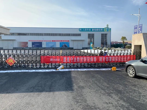 在久諾集團廠區及生產車間,所有復工的職工均佩戴口罩,進出測量體溫;廠區、車間、食堂、宿舍等區域每天定時消毒;所有防疫物資均已準備充足,包括洗手液、口罩、防護服、84消毒液、酒精等,千方百計保護好每一位職工的平安健康。