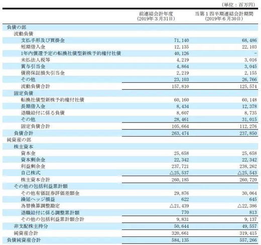流動負債合計為1255.74億日元,同比減少322.35億日元,流動負債的減少是由于雖然短期借款等增加了,但一年內預定償還的可轉換債券型附新股預約權中公司債券減少了所致;固定負債合計為122.76億日元,同比增加66.12億日元,主要原因是長期貸款等增加所致;凈資產總額為3194.15億日元,同比下降12.45億日元。