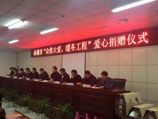 近日,由河南省扶貧開發協會聯合永城市扶貧辦實施的“眾情大愛、暖冬工程”愛心捐贈儀式在市司法局八樓會議室舉行。省扶貧開發協會代會長兼秘書長史獻志,省扶貧開發協會常務理事、省眾情大愛精準扶貧項目組委會主任衛建亞,省扶貧開發協會項目部主任史坤,以及永城市委常委、宣傳部部長畢江遠,副市長梁廷振出席儀式。