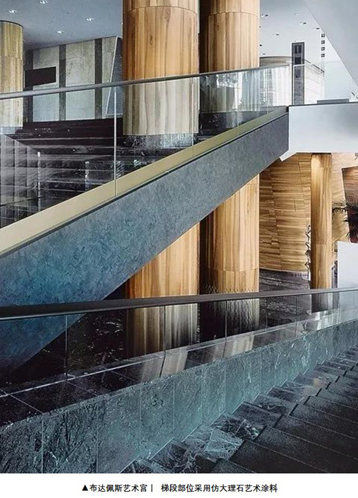 例如仿大理石漆具有天然大理石的質(zhì)感、光澤,對特定造型的飾面,效果尤佳,可以模仿天然大理石的顏色紋理,如布達佩斯藝術(shù)宮在室內(nèi)梯段部位就采用了大理石漆。
