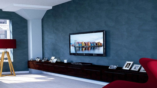 簡約風格是現在大多數年輕人的心頭好,簡潔明快又不容易過時。同樣地,簡約風格的電視背景墻也不需要過多的裝飾,比如使用綠色環保的大寶藝術涂料品牌7+1竹炭凈白墻面漆,將客廳墻面涂刷成純凈的乳白色,并配合時下流行的掛壁式電視機,清新風格立現,而且經濟實惠。