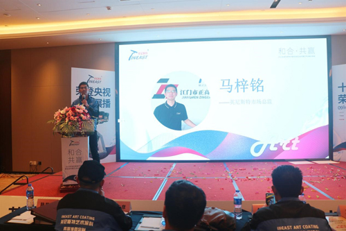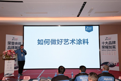 隨后,中國著名資深藝術涂料培訓師張光彥上臺發言,奠定大會高昂的基調。張老師從行業未來趨勢、未來發展前景、銷售市場及渠道等方面,以全局視角解析藝術涂料市場發展趨勢與機遇。