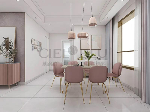 餐廳裝修風格則與客廳保持統一,CIELOBLU基路伯大師金罐•拉斐爾系-都靈巧克力褐-E的墻面裝飾,與粉色餐椅及軟裝的色彩呼應,讓空間更有對話感。