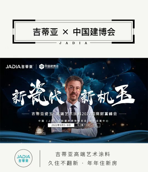 2022年9月5至8日,中國建博會(上海),前來上海虹橋·國家會展中心,與吉蒂亞一同開啟墻面不翻新之旅,感受吉蒂亞瓷玉科技創(chuàng)新的力量!玉出色,愈出彩!吉蒂亞藝術(shù)涂料,在上海等你。