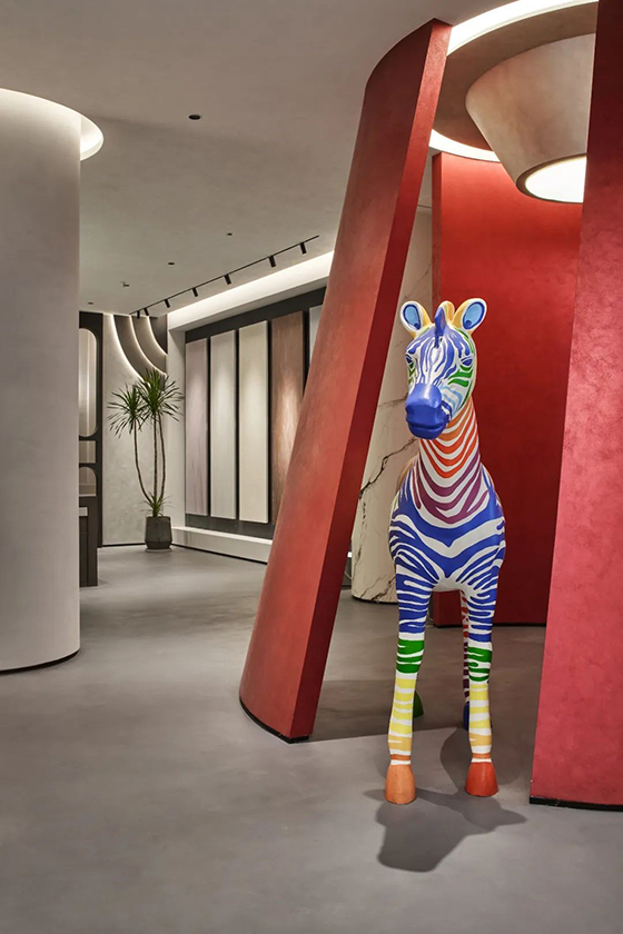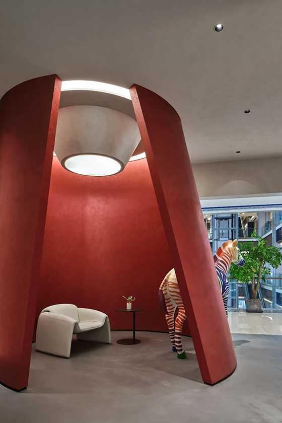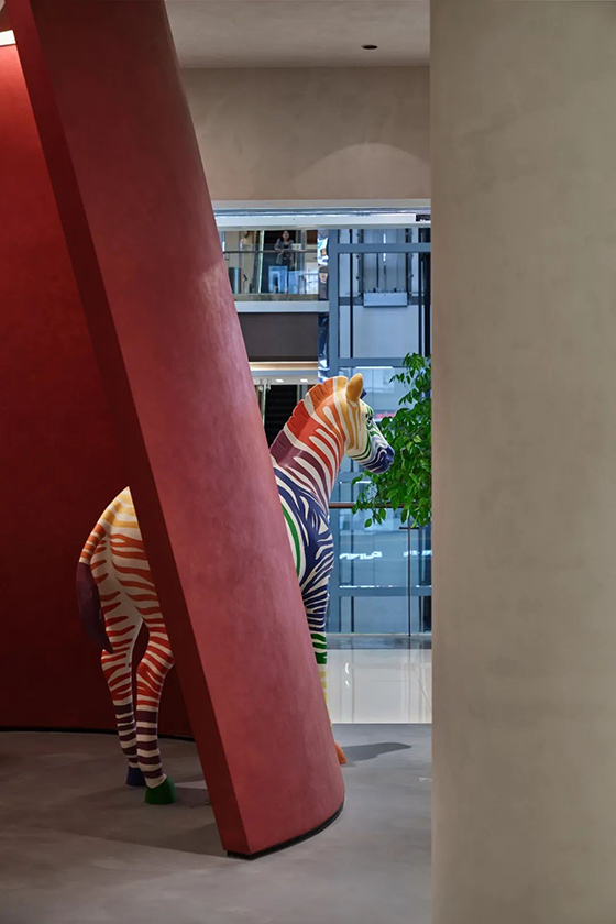 由偉壯老師帶領(lǐng)設(shè)計(jì)師團(tuán)隊(duì),重塑空間和色彩,他們通過(guò)線面不同形態(tài)的交互表現(xiàn),構(gòu)筑的是一種內(nèi)在的情緒關(guān)連與藝術(shù)氛圍。入口處名為「愛(ài)的漩渦」一堵高大的藝術(shù)紅墻,以及使人聯(lián)想到意大利尤文圖斯隊(duì)的「彩色斑馬」打破了枯燥無(wú)味的秩序感,讓整個(gè)店面增添了熱情洋溢的生命力,拉近了人們與品牌間的距離感。