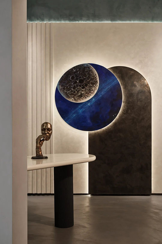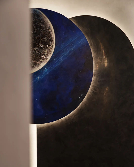 意大利這座藝術(shù)之都,隨著時(shí)空的變幻,為設(shè)計(jì)師的創(chuàng)作帶來(lái)了源源不絕的靈感。設(shè)計(jì)師希望到訪者經(jīng)由入口轉(zhuǎn)向室內(nèi)的角落,由外而內(nèi),循序漸進(jìn),有一種穿越時(shí)空的縱深感。由涂料繪制的一副「宇宙空間」,為空間增添純粹的美感,同時(shí)呈現(xiàn)出一種藝術(shù)與空間的精神內(nèi)核。