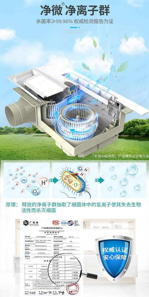 明頂智美浴霸開啟除菌時,釋放大量凈微離子,凈微離子高速提升空氣質量。釋放正負氧離子群,殺菌率達95%, 更能促進血紅細胞循環,美容護膚。經過明頂專業測試,密閉空間殺菌率達99.9%。