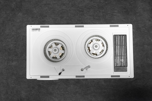 開箱部分直接跳過,來看看產品本身吧。浴霸共分為主體和面板兩部分,主體上是兩個碩大的電機,雙電機可同時工作,暖風和換氣同時進行,這樣冬天在洗澡的時候就不會又悶又熱了。