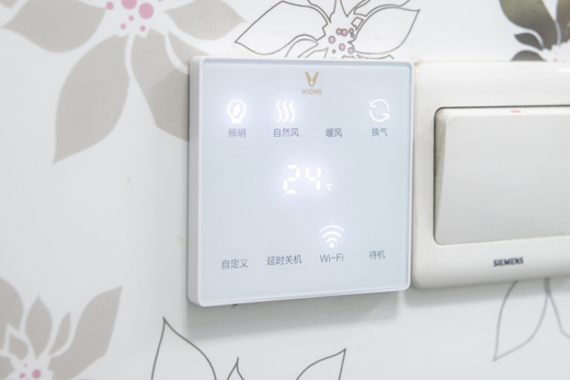 控制面板看上去比較顯檔次,LED屏可以實時顯示環境溫度,同時還有照明、自然風、暖風、換氣、自定義場景和延時關機六個功能可供選擇。