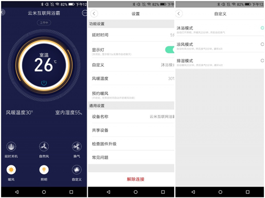 此外,云米互聯網浴霸還有自定義功能,有點類似于手機上的智能場景,它可以根據你的使用習慣,在手機APP上選擇不同的功能組合,一鍵同時開啟。