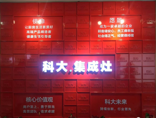 穿過時光隧道來到展廳,墻上醒目的三組圖文格外引人注目。“為什么?金魚能與拉籃共游泳?”“為什么?集成灶上可以跳舞?”“為什么?做飯的聲音不驚醒小貓的甜夢?”所有的答案都因為科大集成灶選材真材實料,環保,低噪音。走進展廳,最先映入眼簾的是科大巨型的紅色logo,由眾多印章組合,簡短而含蓄的文字傳達了科大的使命、愿景、核心價值觀和科大的未來。“至于為什么要用紅色,”還未經記者提問,科大市場部部長歸袁峰先生就做出了解答,“紅色代表嚴肅,代表做科大品牌的決心和信心,即使顏色在整個展廳中略顯突兀,但還是要堅持使用紅色”,歸部長說的堅定而有力。