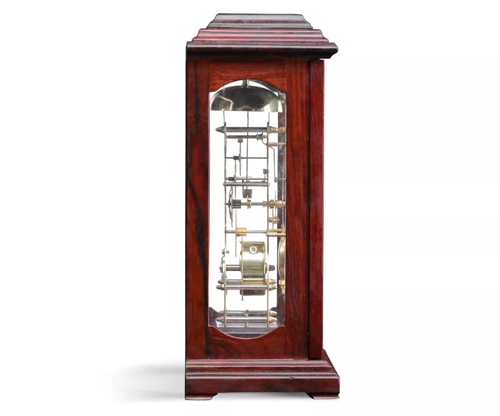 此件大紅酸枝機械機芯座鐘,用料奢華考究,選用上乘的大紅酸枝和玻璃制成柜體框架及底座,底座大紅酸枝紋理流暢自然,四面正中開光嵌玻璃屏面,內置座鐘的金色機芯,是傳統制表工藝與劃時代設計的完美結合。