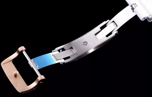 表帶采用馬來西亞頂級橡膠材料制作而成,㬵帶的品質(zhì)可以與原裝互換。精鋼折疊扣經(jīng)過拉絲處理,質(zhì)感細膩。表扣采用鍍玫瑰金處理,上面刻有理查德英文Logo,字體大小深度把控的很棒!