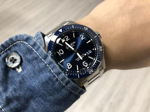 周末去王府井的APM逛街,一層路過格拉蘇蒂原創(chuàng)的專賣店,就進(jìn)去逛了逛。在我印象里GO的正裝表比較有名,結(jié)果進(jìn)店轉(zhuǎn)了一圈,試了幾款,最適合我的竟然是一塊潛水表。銷售小姐姐跟我說這是今年新出的SeaQ大日歷。先上圖!