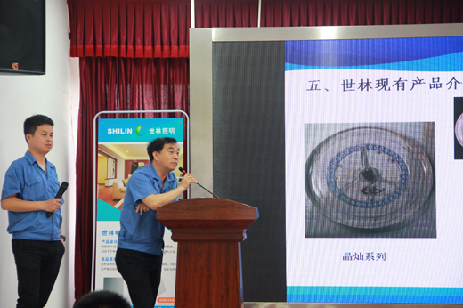 廣東世林照明有限公司總經理謝兵、廣東世林照明有限公司家居事業部總監李新才、廣東世林照明有限公司市場部總監蔡林平、世林照明LED燈具工廠廠長蔣豐武、世林照明LED吸頂燈項目經理岳平飛等領導及項目負責人為大家作了產品知識和市場政策培訓講解。