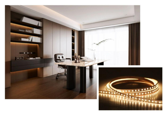 有強有弱才能稱之為重點,所以不是放一盞燈就能成為重點的。為了不喧賓奪主,書房其他區(qū)域的用光就一定要克制。所謂克制,可以視為補充用光,補充用光的關(guān)鍵字是“柔”,開爾照明【精品系列低壓燈帶】90高顯指,無頻閃無藍光,書房補充光非它莫屬。