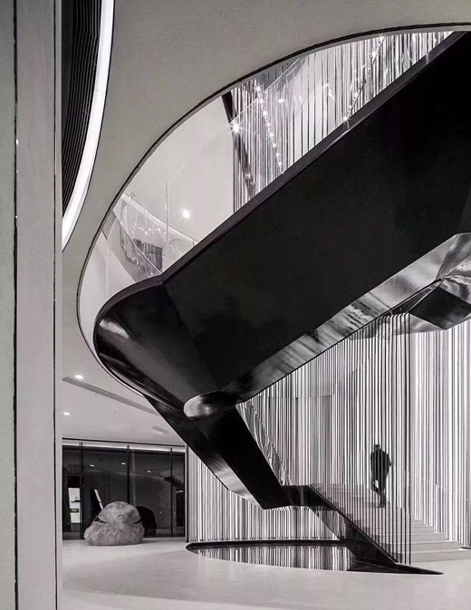 整個空間恰到好處的布光讓白色的極簡的格調更顯皎潔、雅致而絲毫不染冷淡。漫步向前,一個極富雕塑感的旋轉樓梯浮現眼前,移步行走在其中,仿佛是穿梭在偌大的黑白豎琴上,沉醉在這藝術感滿屏的空間之中……