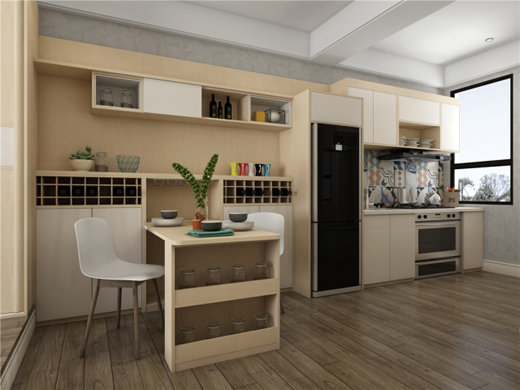 餐廳與廚房呈開放設(shè)計,酒格架、吊柜、餐邊柜一應(yīng)俱全。此外,在餐邊柜中部延伸出L型餐桌,還能節(jié)省不少空間呢!