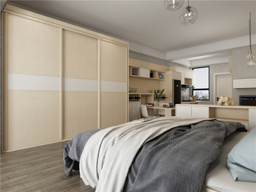 睡眠區(qū)在沙發(fā)背面,以矮柜隔開。整墻的床頭背景柜均采用無拉手設(shè)計,平滑的柜面、白色與楓木色搭配,絲毫不讓人覺得厚重壓抑。