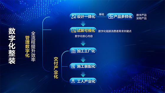 鞏總深入淺出地闡述了整裝3.0模式的全貌——設計一體化、產品多樣化、試裝可視化、加工工廠化、施工裝配化、工人產業化、管理數字化,七個環節環環相扣,將復雜的整裝由傳統的人力驅動轉變為系統驅動,讓個性化的整裝也可以規模化交付,讓原始的項目制變為工業化運轉。