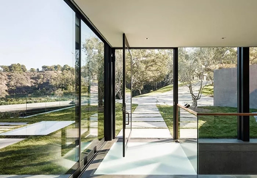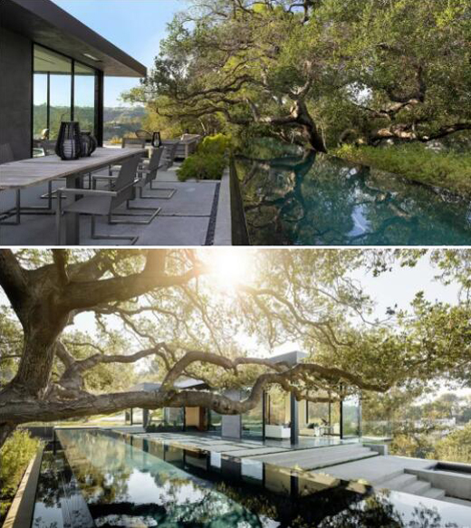 建筑頂樓設有娛樂區,三分之二的房子位于山坡下,客人都會因為自然光進入到屋內而感到暈眩,因為這棟超現代房屋與自然環境完全融為一體。更重要的是,圍繞在房屋周邊的130多棵活了250年受保護的橡樹,就像一個又一個的守護者,安靜的立于旁邊,充滿了無窮無盡詩意化的想象與來自大自然的禮贊。